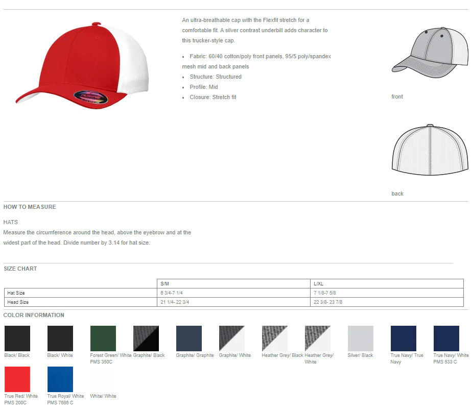 - Fabric: 60/40 cotton/poly front panels, 95/5 poly/spandex mesh mid and back panels