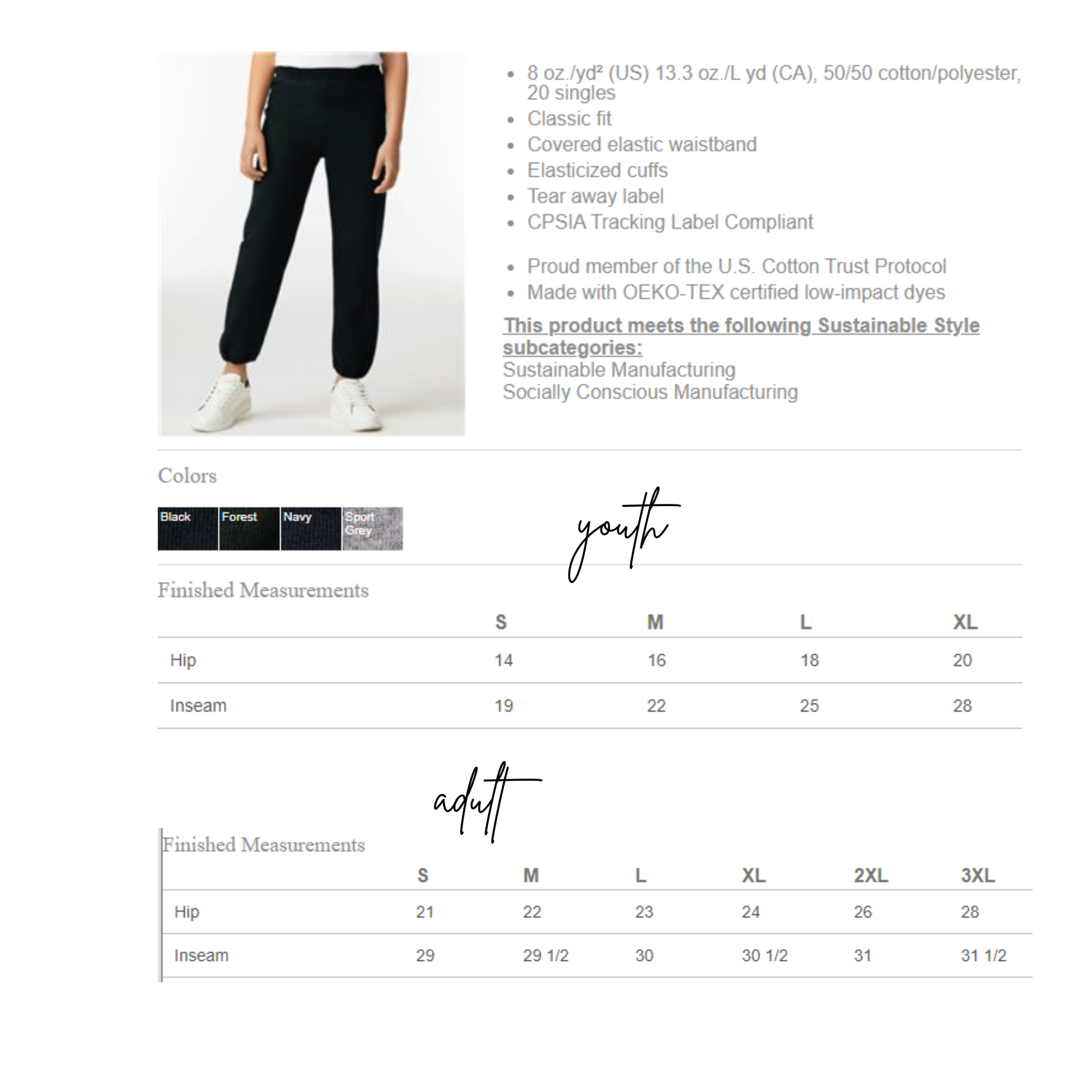 - 8 oz./yd² (US) 13.3 oz./L yd (CA), 50/50 cotton/polyester, 20 singles